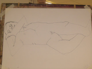 We then began to draw our life model Rupert, using black pen. We had to use a continous line, and I think this is what I struggle with. I dont like using pen to draw with, and I dont think continous line suits me.